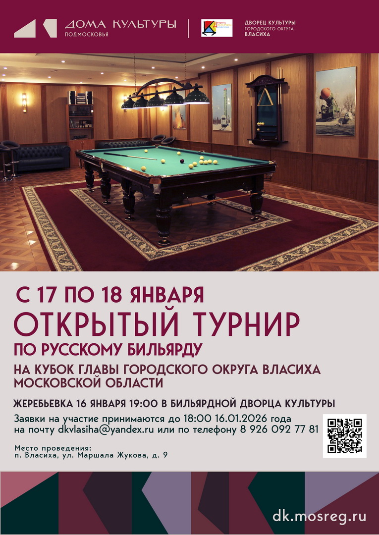 С 17 по 18 января 2026 года во Дворце культуры состоится турнир по бильярду (свободная пирамида) в формате личного первенства на Кубок главы городского округа Власиха, посвященный Дню образования ЗАТО Власиха.