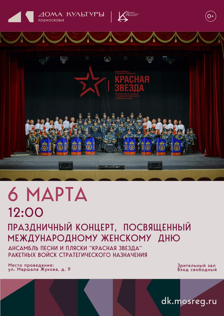В преддверии Международного женского дня Дворец культуры приглашает на особенный вечер! 6 марта в 12:00 легендарный ансамбль песни и пляски «Красная звезда» РВСН подарит вам незабываемый праздничный концерт!